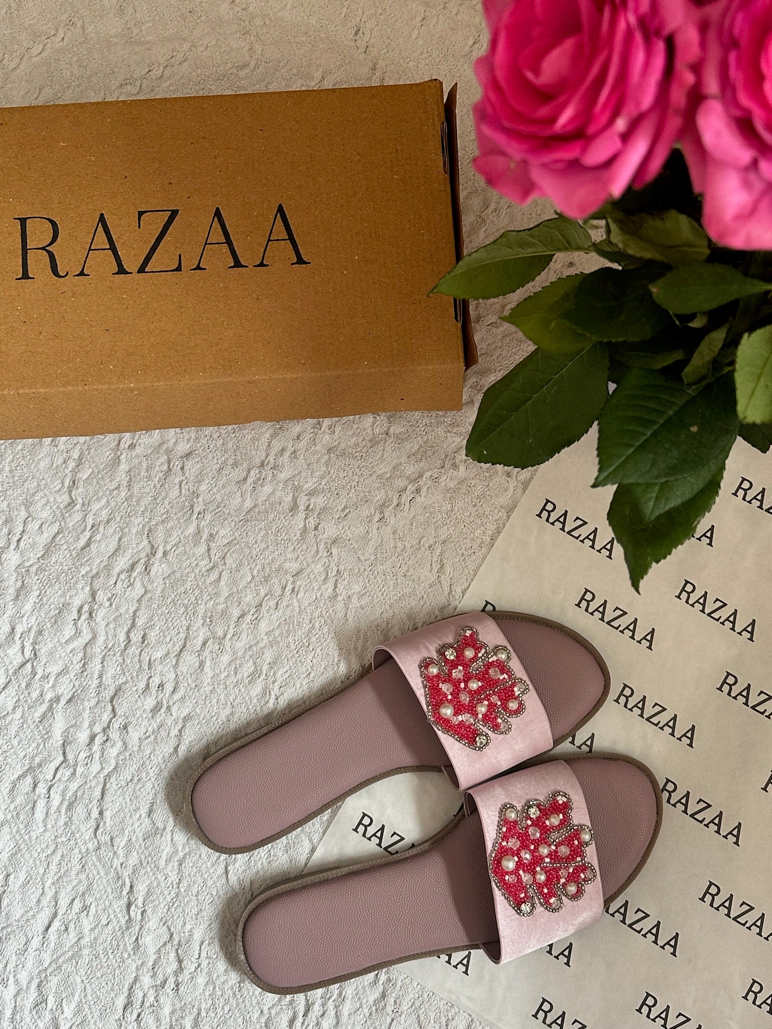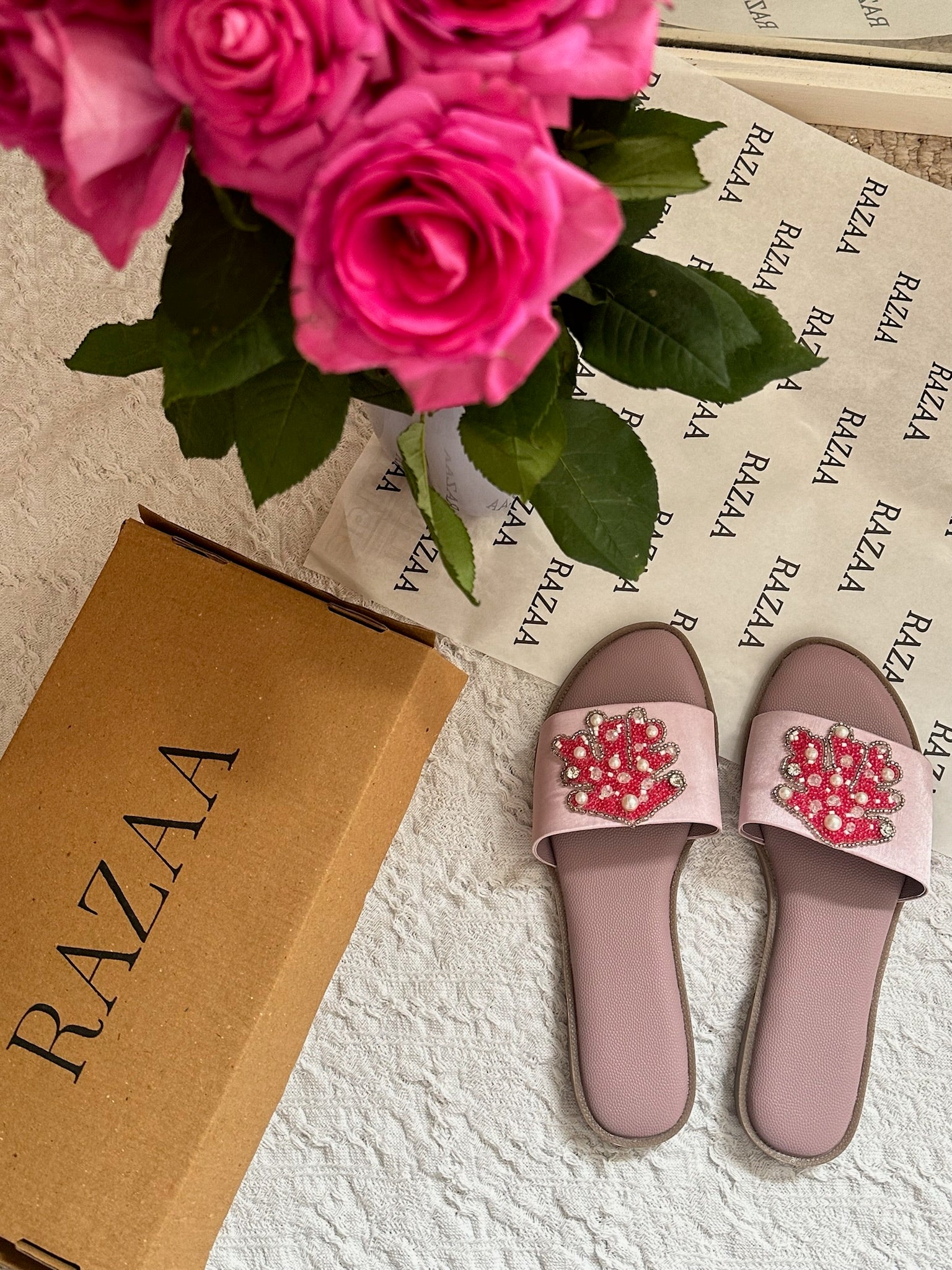 Step into timeless beauty with IBIZA, our exquisite pair of flats designed to blend comfort with luxury. Crafted in a rich royal purple hue, these flats are delicately hand-embroidered with pearls and carefully selected pink beads, creating a graceful balance of sophistication and charm.